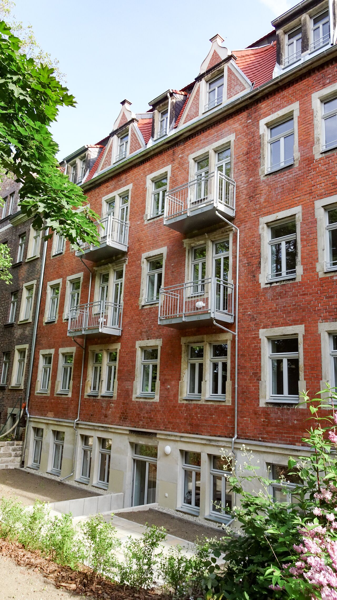 Sanierung, Umbau und Nutzungsänderung eines repräsentativen Gebäudeensembles von etwa 1903 – bestehend aus einem Vorder- und Hinterhaus mit einem reizvollen Innenhof und altem Baumbestand – zu insgesamt 19 Wohnungen.